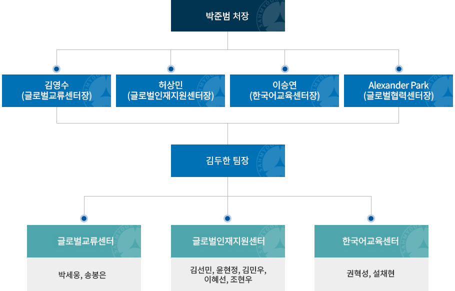 | 국제처 | 팀장 | 김두한 | 국제처 정책 수립 및 실무 총괄 | 02-3399-3601 | doohk@syu.ac.kr |